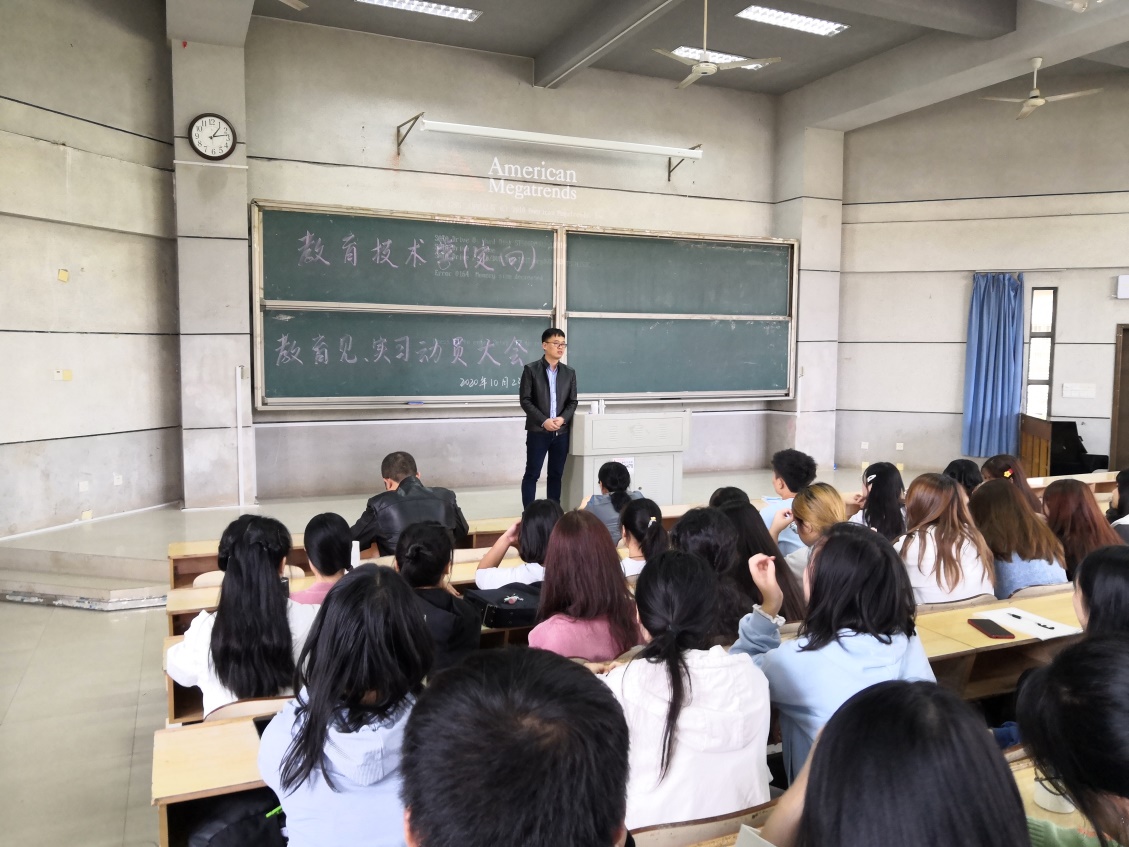 10月23日中午,买球官网组织2018、2019级六年制教育技术学专业全体学生,在润寰南105召开了2020年教育见习及教育实习动员大会。学院副院长何向阳、党总支副书记成夏炎及带队教师祁玉娟、刘琳出席,小学信息技术教育教研室主任黄悦主持大会。